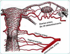 Primarily from the uterine artery (branch of the internal iliac artery).